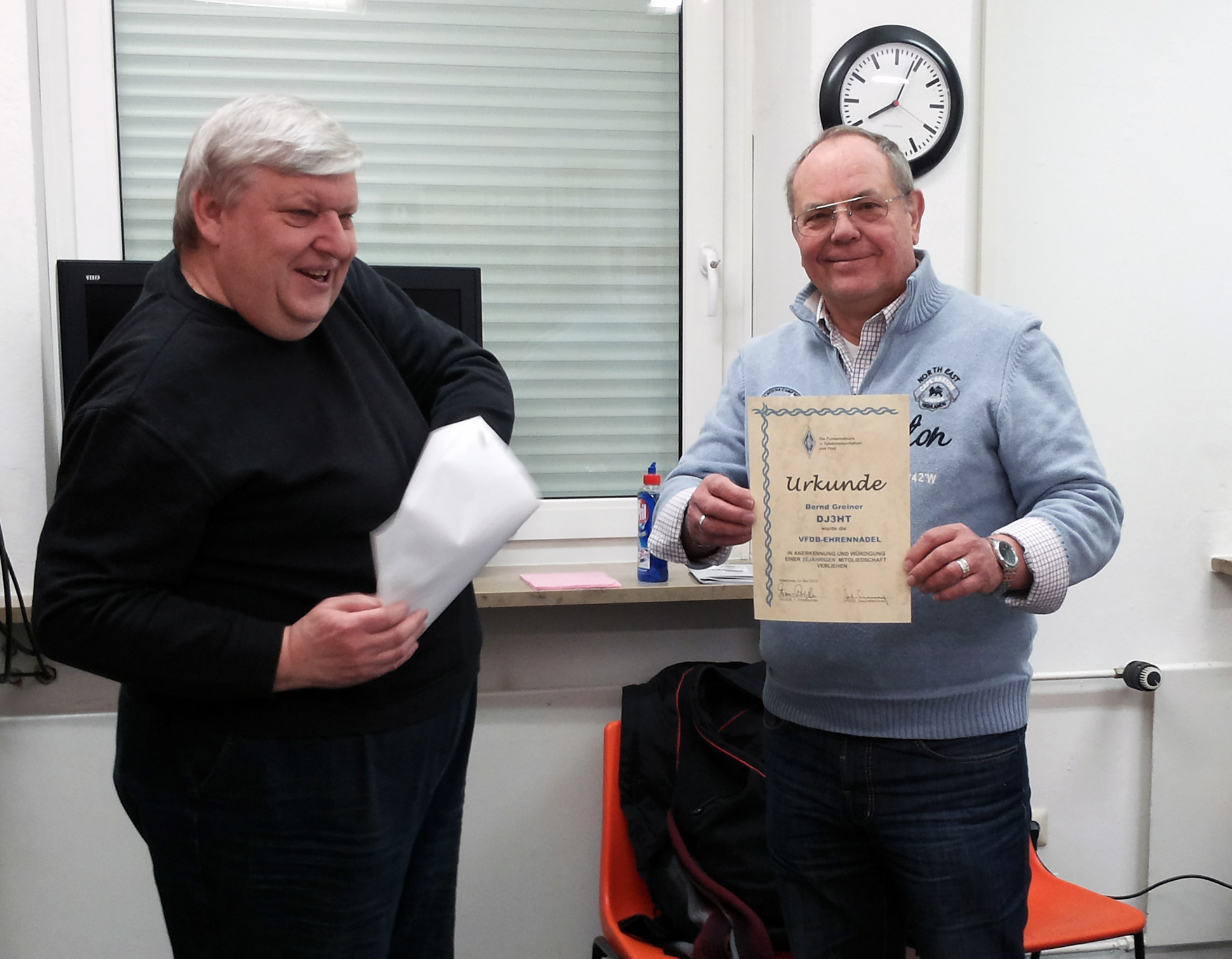 An unserem OV-Abend am 25.03.2013 hat unser Mitglied Bernd DJ3HT mit etwas Verspätung seine Ehrennadel für 25 Jahre Mitgliedschaft im VFDB erhalten und diese stolz entgegengenommen.